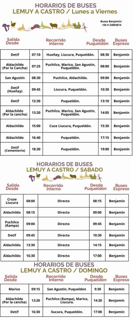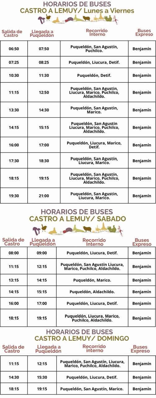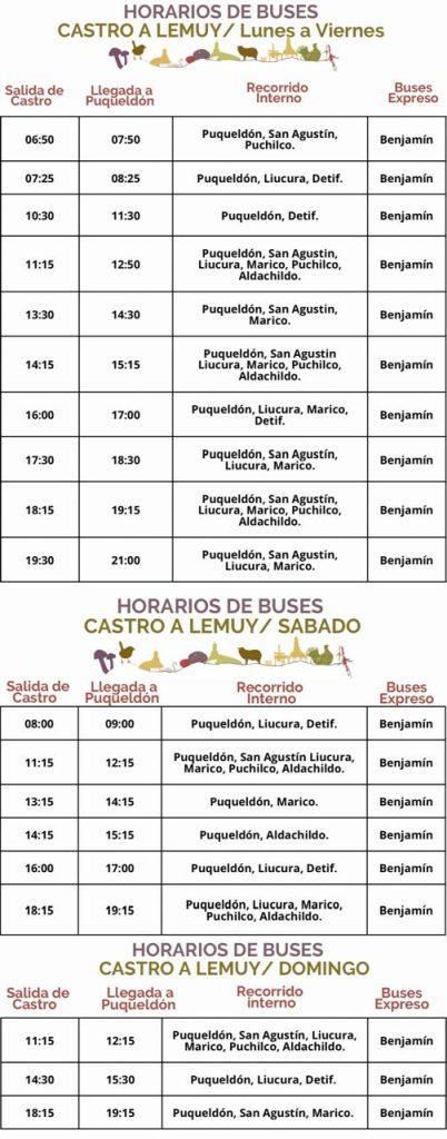 Si vienes en bus, desde el Terminal Municipal de Castro, existen frecuencias y horarios que se adjuntan. Estos buses pasan igualmente por Chonchi y cruzan el Canal Yal en transbordador. Puedes chequear su recorrido por Isla Lemuy de acuerdo a tus preferencias.